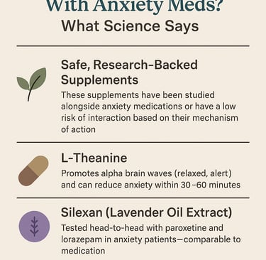 Combining supplements with anxiety medication can be safe and even beneficial — when done right. Evidence-backed options like L-Theanine, Silexan, Magnesium L-Threonate, and B-Complex offer real, measurable effects in human studies — and are generally compatible with SSRIs and other common meds.